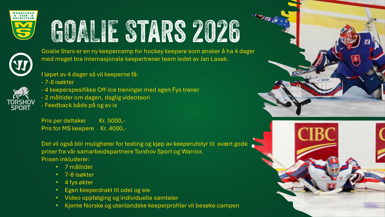 Goalie Stars er en ny keepercamp for hockey keepere som ønsker å ha 4 dager med meget bra internasjonale keepertrener team ledet av Jan Lasak.