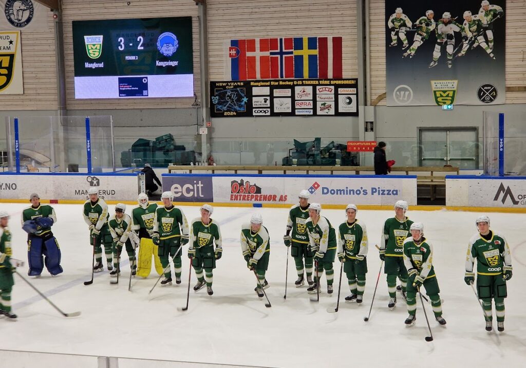 Den tredje perioden startet vi i undertall, og måtte etter hvert jobbe oss gjennom både spill 4 mot 5 og 3 mot 5. Dette lyktes vi godt med, men da vi senere selv fikk flere overtall lot fortsatt punkteringen vente på seg. Men gutta kjempet godt og holdt gjestene unna målprotokollen resten av kampen, dermed ble tre viktige poeng igjen på Manglerud. Litt ekstra skryt også denne gangen til en lettere mørbanket Shafaat Hashim, som igjen ofret liv og lemmer og også måtte en ekstra tur i garderoben underveis. Heldigvis kom han seg på is igjen, og fikk feire seieren sammen med lagkameratene.